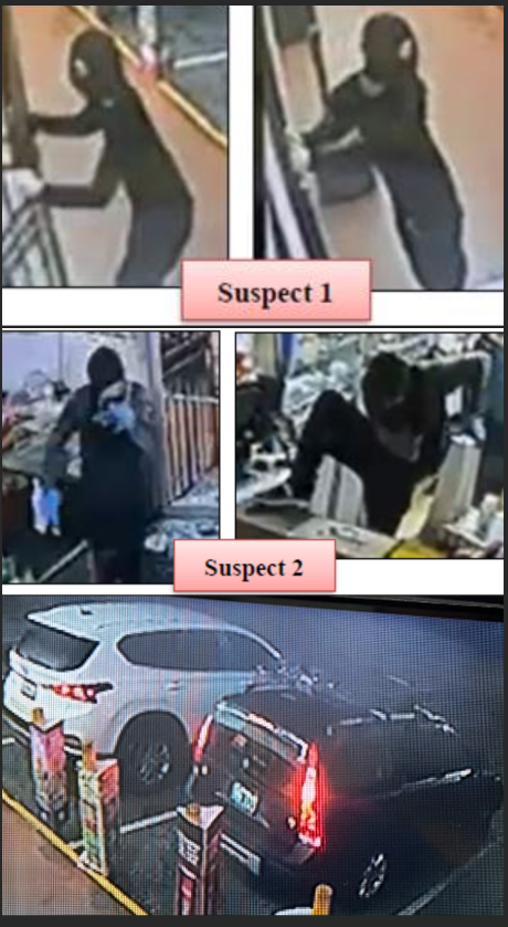 Two suspects (both of whom are believed to be white) are described as being tall with slender builds, and both wore masks.