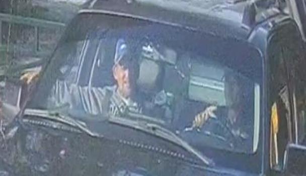 The driver is a white male (unknown age) wearing a dark shirt and a baseball style hat. The passenger is a white male between 40-60 years-old, wearing a gray hoodie with unknown writing on the front, and a possible blue baseball hat.
